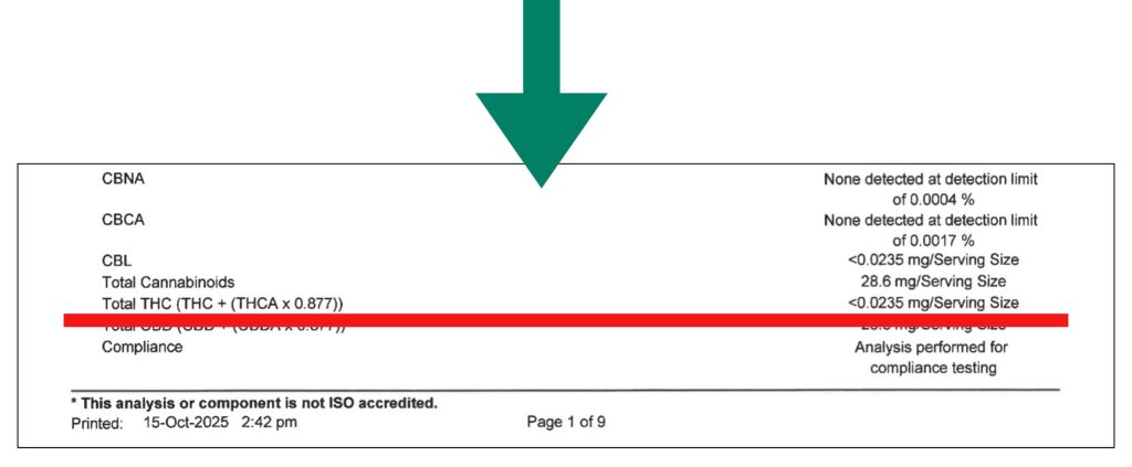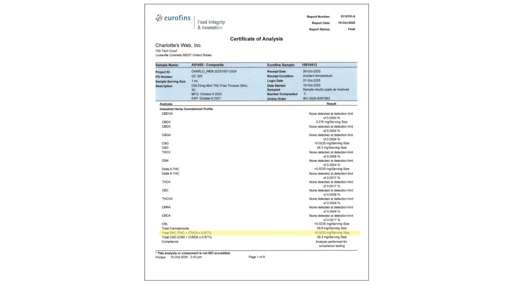 ところが今回の規制では、向精神作用を求めてではなく医療目的で使用されている製品の多くも規制の対象となります。たとえば下は、シャーロッツ・ウェブのティンクチャーの中で特に「THCフリー」と謳っている製品の分析証明書ですが、1回の用量(1 ml)あたりのTHC総量が 0.0235mgとなっており、この30 ml入りの製品は 30回分なので、ボトル全体に含まれるTHC総量は0.705mg となり、政府が新たに定めた基準値(0.4mg)を超えてしまうのです。