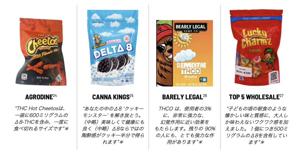 カリフォルニアで販売されていたヘンプ由来合成カンナビノイド製品の例。