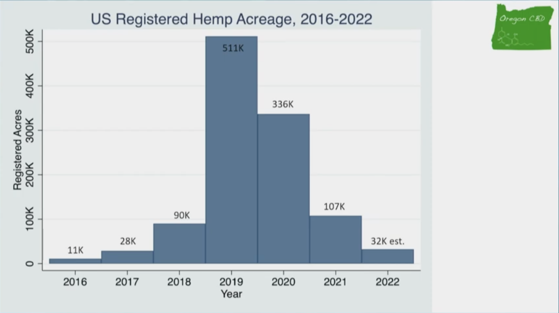アメリカにおけるヘンプの栽培面積の推移 (Source: CannMed 2022, Oregon CBD のプレゼンテーション)