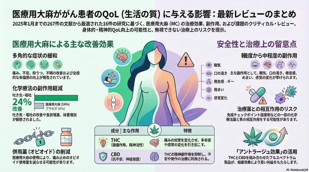 その中でも近年、世界的に注目を集めているのが医療用大麻(Medical Cannabis: MC)です。本記事では、2026年に発表された最新の学術的レビューに基づき、医療用大麻ががん患者のクオリティ・オブ・ライフ(QoL)にどのような影響を与えるのか、その科学的根拠と課題を詳細に解説します。