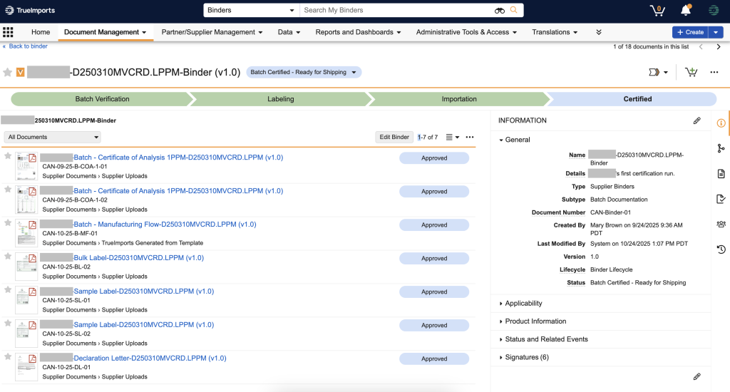 日本市場に投入を希望する製品の COA を検証し、その結果を我々が開発した QMS システム(電子品質管理システム)に登録します。この QMS システムは、C15 Solutions 社および Veeya QualityOne 社と共同で開発したもので、世界の製薬企業・消費財製造企業の 70%以上が使用している QMS を基盤としています。Veeva QualityOne 社の顧客には、Pfizer、Bayer、Merck、GSK、Nestle、P&G などが含まれます。C15 Solutions 社がこれを大麻業界用に特化させたものが TrueImports の QMS です。