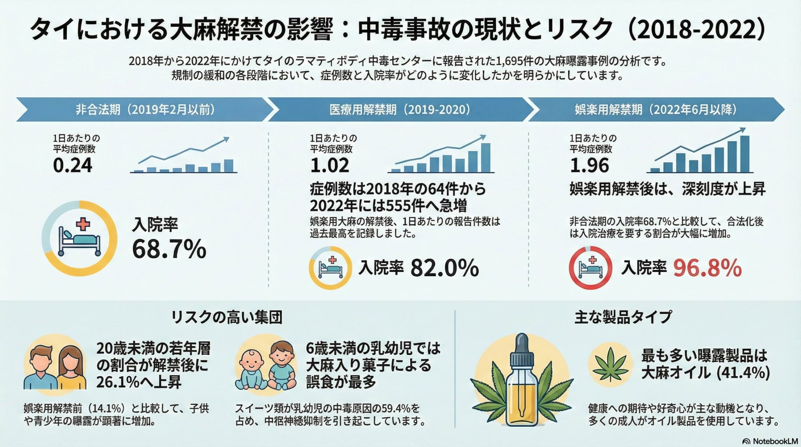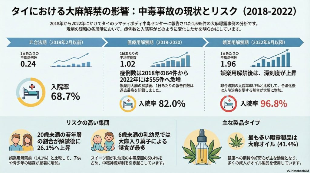 参考:Bootsakorn Paisarnrodjanarat, Sahaphume Srisuma, Puangpak Promrungsri, Theerapon Tangsuwanaruk, Achara Tongpoo, Panee Rittilert & Manutsanun Mayurapong. “Cannabis product exposures reported to Ramathibodi Poison Center, Thailand, during 2018–2022”.• 掲載誌: Clinical Toxicology, Volume 63, Issue 10, pp. 760–769 (2025年).